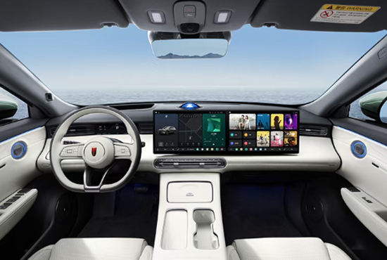 来到车内,整体设计充满科技感,触手可及的地方多为软质材料包裹。15.6英寸中控屏和15.6英寸副驾娱乐屏显示清晰,车机支持多种手机互联方式,可实现四区域语音唤醒识别。