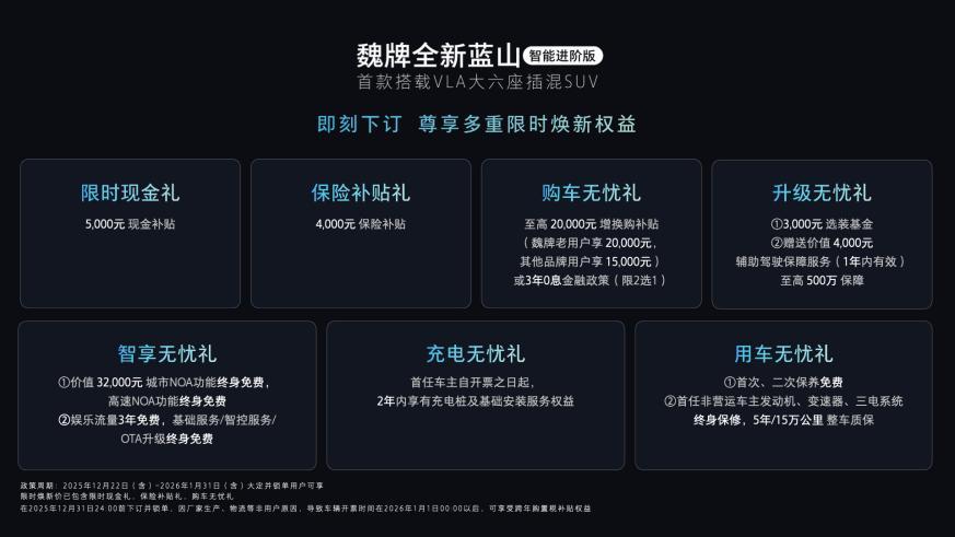 魏牌全新蓝山智能进阶版同步推出诚意十足的购车权益:限时现金礼:5,000元现金补贴;保险补贴礼:4,000元保险补贴;购车无忧礼(限2选1):①至高20,000元增换购补贴(魏牌老用户享20,000元,其他品牌用户享15,000元)②3年0息金融政策;充电无忧礼:首任车主自开票之日起,2年内享有充电桩及基础安装服务权益等。
