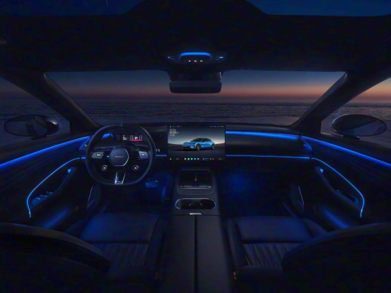 而此次全新小米SU7在内饰方面也有所变化,整体沿用了现款SU7的布局,新增了暗夜黑内饰,采用翻毛皮材质,搭配银色金属铭牌与缝线,显得颇为高档。同时氛围灯的照射面积更大,环绕感也更强,晚上一亮跟奔驰有得一拼了。