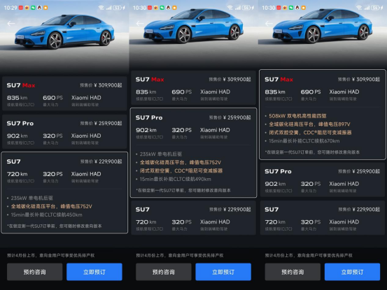 谍照图在网上流传,现车开放选购,现款SU7诸多选配下架,前段时间这些迹象都在表明全新SU7真的要来了。而就在今早,小米正式官宣了全新一代SU7,并开启了小订,预售22.99万-30.99万元,相较于现款SU7来讲,它的升级可真不少,而且求生欲更是拉满!接下来我们一起来深度解析一下。