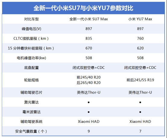 这次全新一代小米SU7的升级可谓不少,从上表我们也可以看出整体技术规格已经向YU7看齐了。而且很多升级都解决了上一代的痛点,比如事故发生门锁打不开?那就加机械冗余!辅助驾驶不安全?那就全系激光雷达+700TOPS算力芯片!轮胎面条胎?那就全系后轮265宽胎!可以说全新小米SU7真的是一辆求生欲满满的车,今年4月份就会正式上市,不知道你们会不会期待呢?