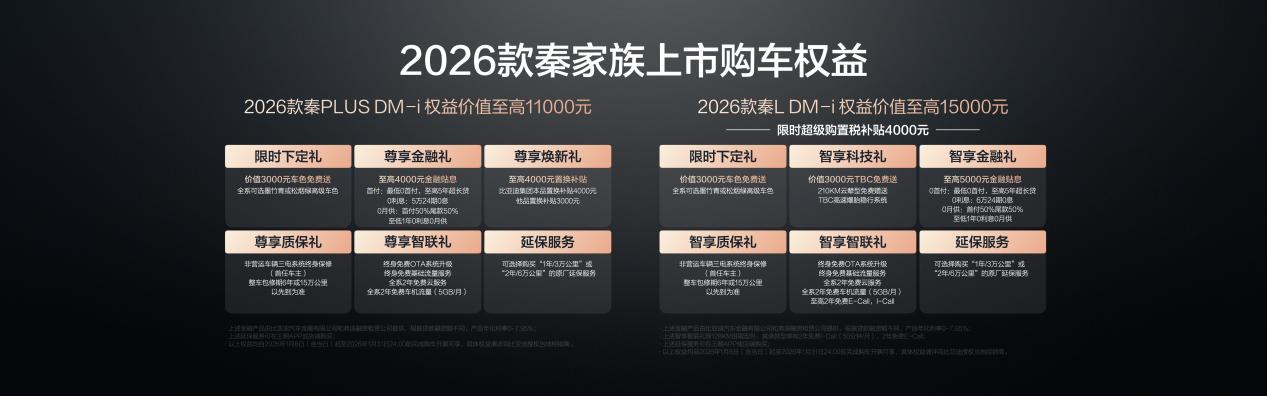 值得一提的是,2026款秦L DM-i 210KM长续航版为追求品质的家庭带来进阶之选,推出价值至高15000元的多重权益。在1月31日前下单,可以享受限时超级购置税补贴4000元;购买210KM云辇型,还可以免费获赠TBC高速爆胎稳行系统,让用户购车更省钱,出行更安全。