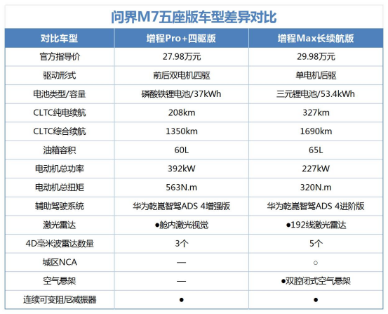 既然Max价格下探了,肯定会有人在想这四驱Pro+和后驱Max该选哪个?那我们就拿五座版的增程长续航版Max和Pro+做对比,我们就可以发现,Max贵的这两万,除了动力和通过性削弱外,在辅助驾驶、底盘和续航层面都提升太多了,个人感觉买Pro+真不如直接上后驱Max,毕竟都买华为系的车了,那辅助驾驶的优先级肯定比起动力要更高一点,对四驱有需求直接上四驱Max就行。