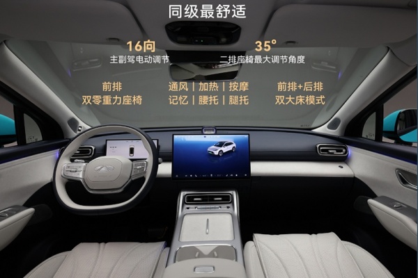 内饰方面,新车搭载17.3英寸中控屏搭配液晶仪表,并提供双辐式方向盘。后排还提供17.3英寸吸顶屏,并配备车载冷暖冰箱。新车搭载灵犀座舱,并配备猎鹰700+智能辅助驾驶,可实现城市NOA及高速NOA。