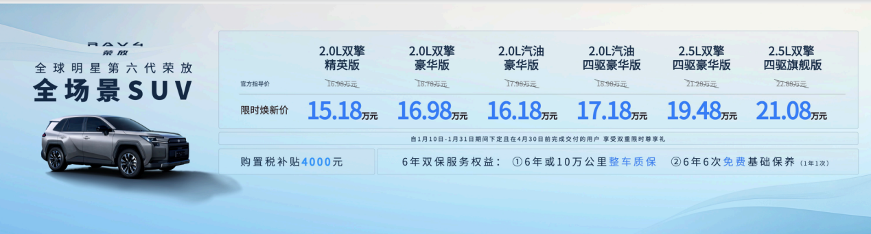 全能担当全新荣放,作为本次交付的主角,其官方价格区间为16.98万元-22.88万元,限时焕新价15.18万元-21.08万元。1月10号-1月31日期间下定且在4月30日前完成交付的用户,即可享受4000 元购置税补贴+ 6年双保服务权益。