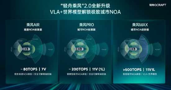 乘风PRO:基于安全可解释端到端技术打造,提供普惠型城市NOA体验,约200TOPS算力,采用11V或11V1L传感器配置;