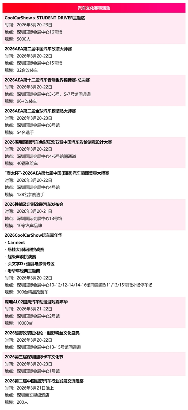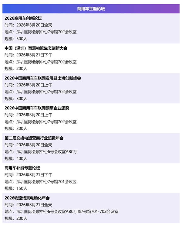 2026年展会同期将围绕乘用车、商用车、跨境出海、汽车文化等热点,设置70+场行业趋势论坛、国际技术峰会、跨境电商大会、文化赛事,以前瞻议题和深度洞察,为全产业链的参与者带来新的启发与合作契机,注入强劲发展动能,共同助力企业在转型浪潮中抢占先机。