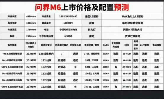 从这个表中的信息来看,制作这个预测表的作者应该很大程度上参考了问界M7的定价和配置划分逻辑,并且增程版的价格颇具竞争力,同样是增程SUV如果要凑齐四驱动力加激光雷达,智界R7需要30,98万,问界M7需要31.98万,而表中的问界M6却仅需25.98万。
