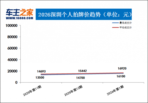 作为2026年首拍,深圳铁牌价格有明显上涨。其中最低成交价涨至16100元,平均成交价涨至16920元。