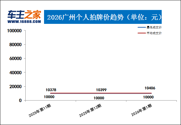 广州拍牌最低价依旧是保持在10000元,而平均成交价略微上涨,达到10406元。