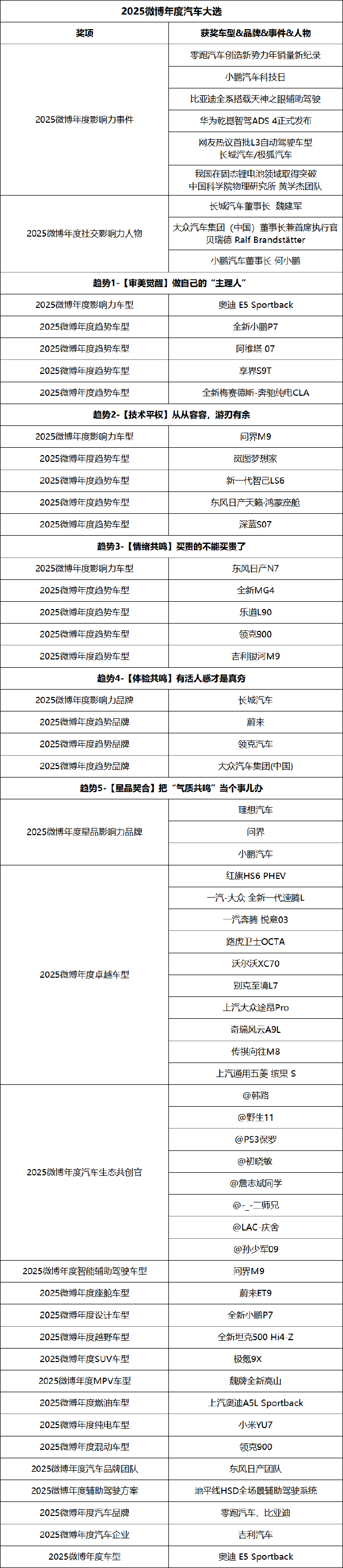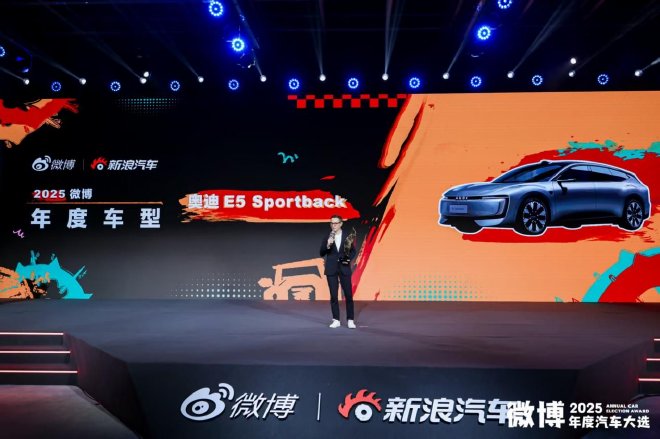 过去一年中,诸多现象级汽车热点在微博登榜,微博深入观察当下新世代年轻人购车趋势,通过微博社交属性不断助力汽车品牌的价值增长,帮助品牌重新定义产品功能点的情绪主张。就如新浪汽车微博运营主理人施晨浩在演讲中表达的观点,每一款车都会在微博上,被无数年轻人共同重新定义。也只有在微博,我们能够通过对用户进行场景化的洞察,找到年轻人的购车趋势。而基于此,立足当下用户需求的变化趋势,根据微博网友在智驾、座舱、设计、性能等方面的内容提及度,结合微博大V推荐、网友投票权重、核心评委打分权重,综合评议,微博年度汽车大选评选出2025微博年度智能辅助驾驶车型、2025微博年度座舱车型、2025微博年度设计车型等等。此外,综合车型在微博平台的热点、用户功能点讨论、专业质价比、社交传播与互动等多维度的声量表现,综合销量的突破性表现,经行业专家评委的综合推荐最终评定,奥迪 E5 Sportback(配置|询价),荣获2025微博年度车型。