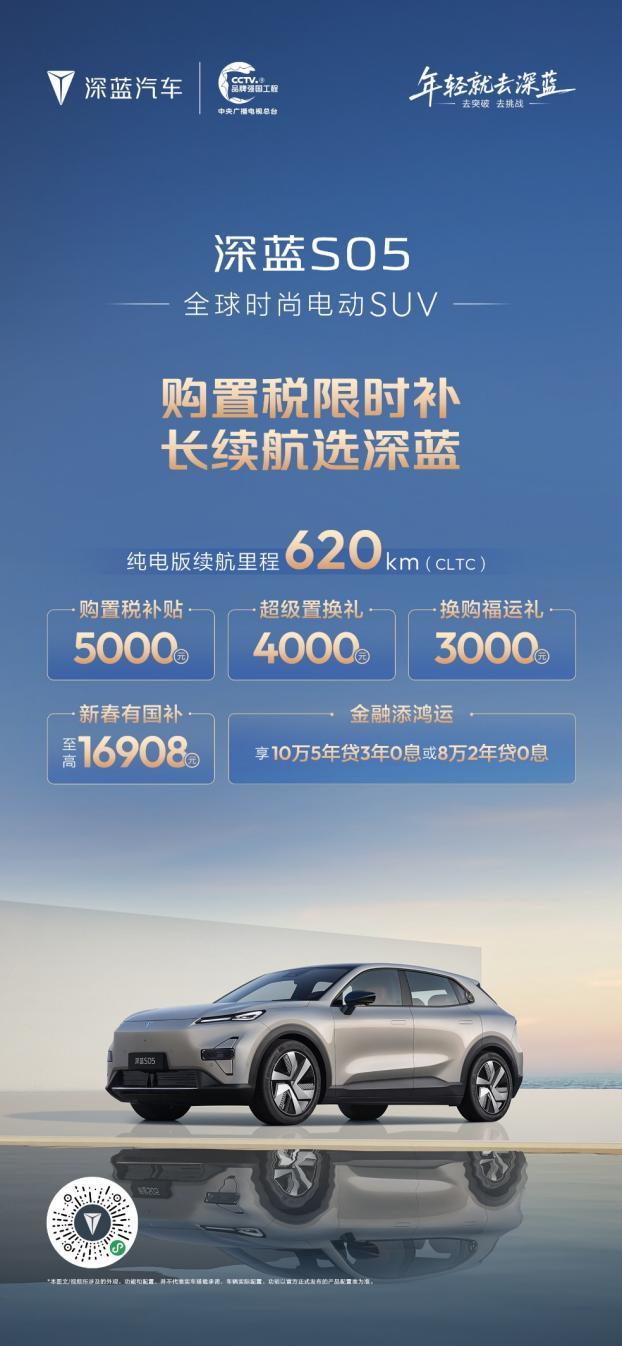 为回馈用户厚爱,现在下订深蓝S05,可享5000元购置税补贴、4000元超级置换礼、3000元换购福运礼、至高16908元新春国补,金融方案同样提供10万5年贷3年0息或8万2年贷0息选择。无论是首次购车还是置换升级,消费者都能享受到实打实的优惠,质价比优势突出。