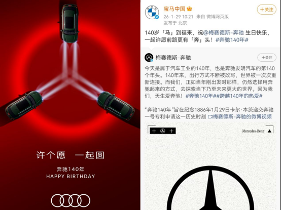 首先那肯定要说BBA三兄弟中的宝马和奥迪啦,它们可是惺惺相惜的老对手了,以前奔驰周年生日时也经常互动。这次奥迪用三辆奥迪Q5交叉打光绘制了三叉星的图案,突出了自己“灯厂”的特点,颇具创意。而宝马则是发了一条文字动态,“马”到福来,前路更有“奔”头的表达可以说你中有我,我中有你,不过宝马你海报去哪了?这比起隔壁的奥迪可少点排面啊!