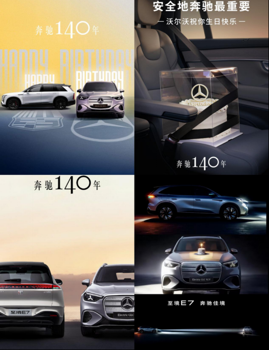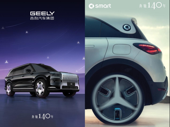 接下来我们再来看看奔驰的“近亲”们,吉利不必多说,那可是戴姆勒集团最大的单一股东!并且海报中也没忘了把自家的台柱子极氪9X拿上来宣传一下。而smart作为吉利与奔驰合资的“孩子”,它也送去了祝福,海报中的车型是smart精灵#1,轮毂的样式正是奔驰三叉星,也是很走心了。