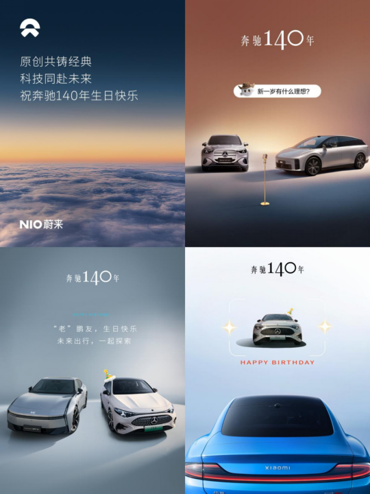 我们将目光再次投向国产新势力车企,蔚来、理想、小鹏和小米纷纷发来祝福。蔚来着重强调自身与奔驰理念契合、目标一致。理想i6与奔驰纯电GLC合拍留影,还借助理想同学开展了互动采访。小鹏P7也与奔驰纯电CLA进行了一次合影,而小米SU7 Max则与奔驰纯电CLA相互“对视”,对小米而言,奔驰既是竞争的对手,也是学习的榜样。