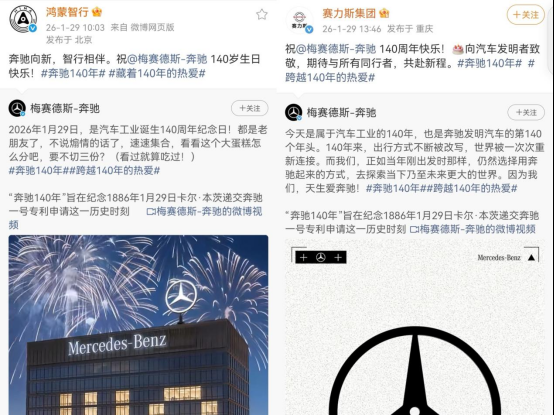 当然比较意外的是,就连鸿蒙智行以及赛力斯也发动态为奔驰庆生了,毕竟目前在高端豪华市场上尤其是问界和尊界都给奔驰造成了不小的麻烦,甚至还挤走了不少奔驰门店,但在这么一个值得纪念的日子里,客气地祝福一下也没什么大不了的。