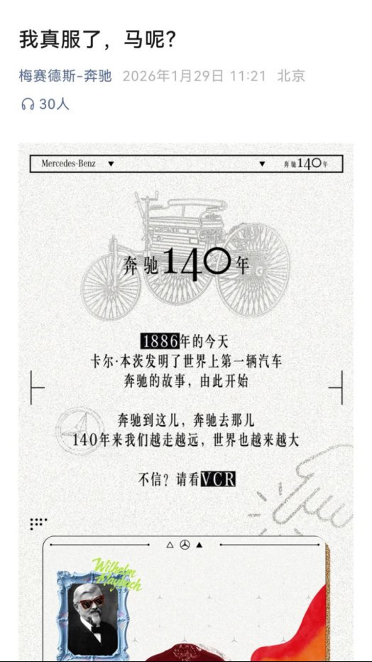 要说这场140岁生日宴上最抽象的,还得是大寿星奔驰自己。毕竟人家一条庆生动态的标题就是《我真服了,马呢?》,这表明在奔驰发明汽车后马车已经被取代,汽车成为新的主流通行方式,这句疑问可以说透着一股骄傲的意味。至于马被“赶到”哪里去了?我猜应该在你的“宝”那里吧,毕竟是宝马嘛。