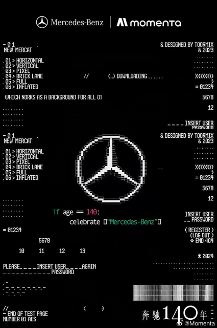 其实除了车企之外,各行各业都为奔驰发来了祝福,个人觉得在这些祝福当中,最有创意的就是Momenta,作为奔驰纯电CLA辅助驾驶方案的供应商,Momenta的庆生海报有着非常多的要素,海报中心是代码生成的像素化奔驰LOGO,各种命令行文字让观众仿佛通过代码参与这场140周年的庆生。
