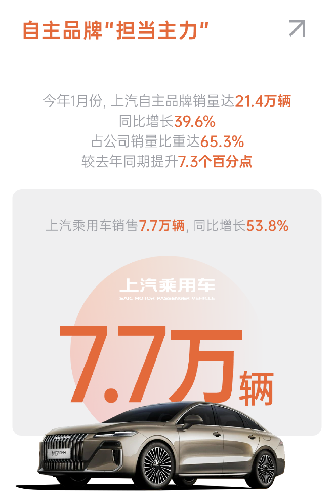 自主品牌已成为上汽集团绝对的增长支柱。1月份,上汽自主品牌销售21.4万辆,同比大幅增长39.6%。