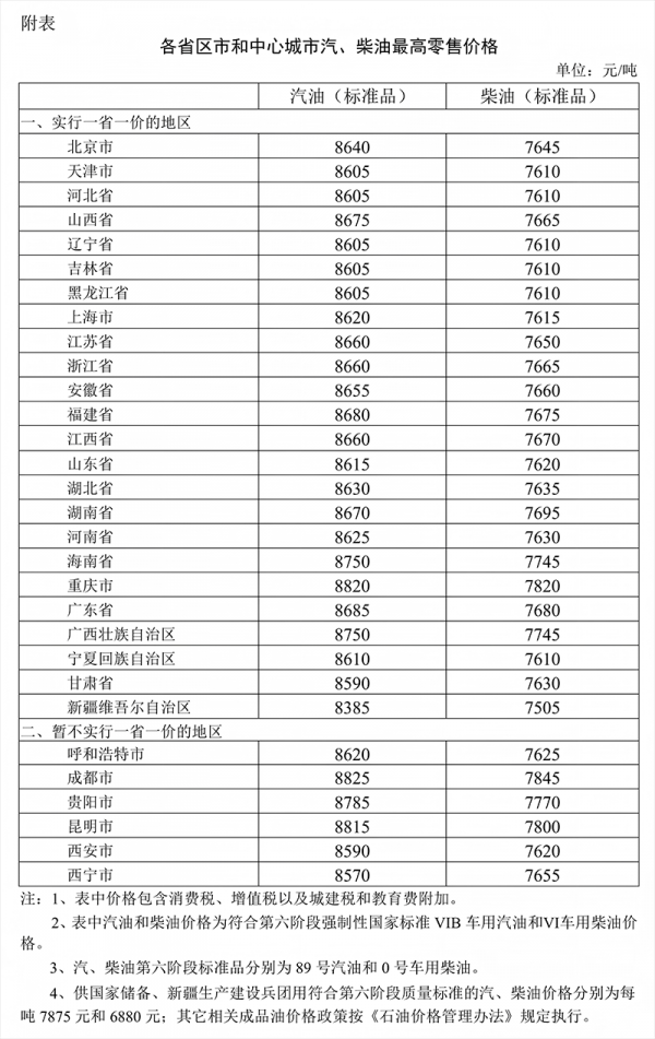 附:各省区市和中心城市汽、柴油最高零售价格表
