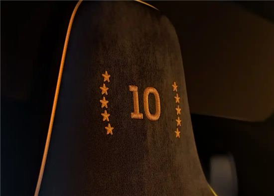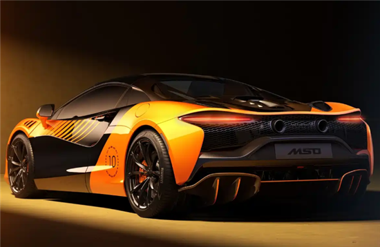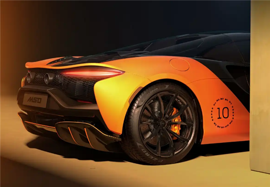 新车外观采用亮橙色与玛瑙黑双色涂装,致敬2025赛季F1赛车MCL39。车尾“10”字拉花由10颗星星和10款冠军赛车剪影环绕,辨识度拉满。车辆配备10辐高光黑锻造轮毂,内部橙色刹车卡钳形成撞色效果。