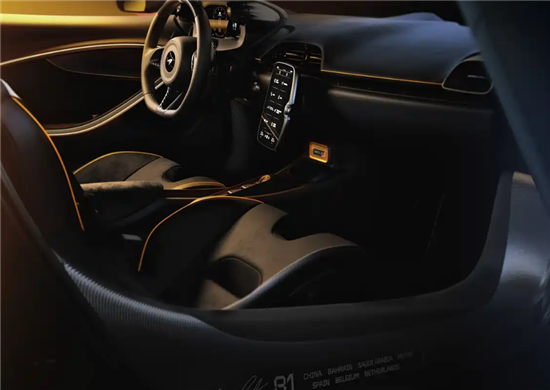 内饰以Carbon Black Alcantara和Jet Black Nappa真皮包裹,橙色缝线点缀细节。座椅头枕、方向盘带有专属标识,门槛饰板印有两位车手的亲笔签名及2025赛季高光分站信息,中控下方镶嵌限量标识。