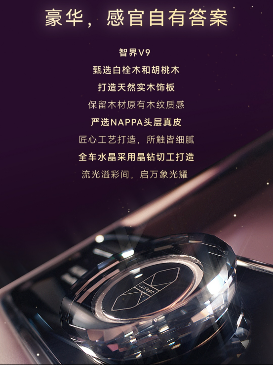 同时在内饰用料方面智界V9也毫不含糊,车中的皮料都是NAPPA头层真皮,实木饰板采用白栓木和胡桃木,并且全车的水晶采用晶钻切工打造,这可是尊界S800同款工艺。