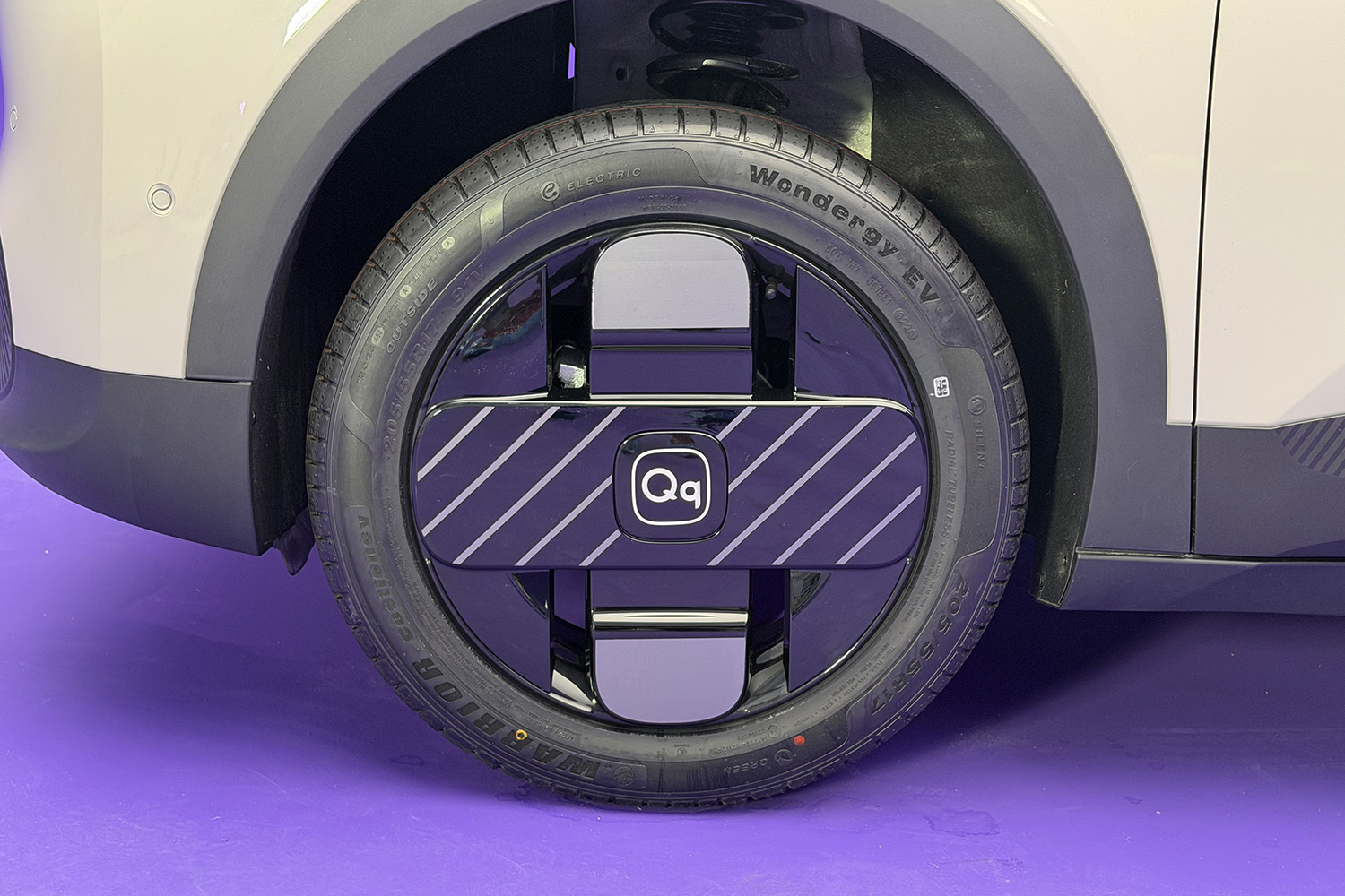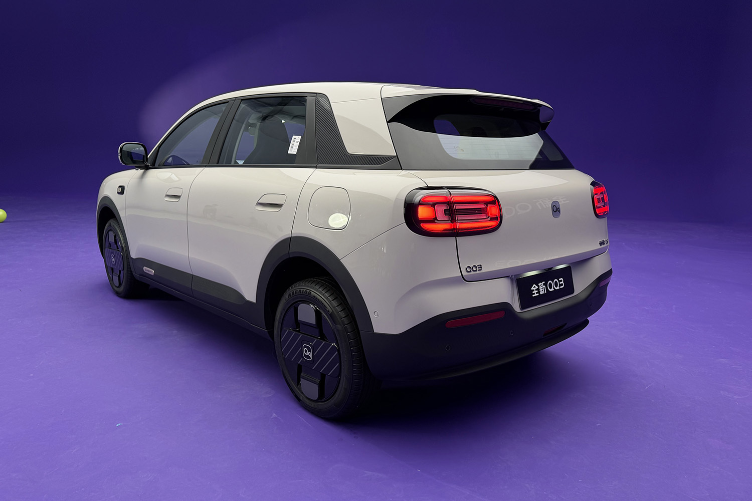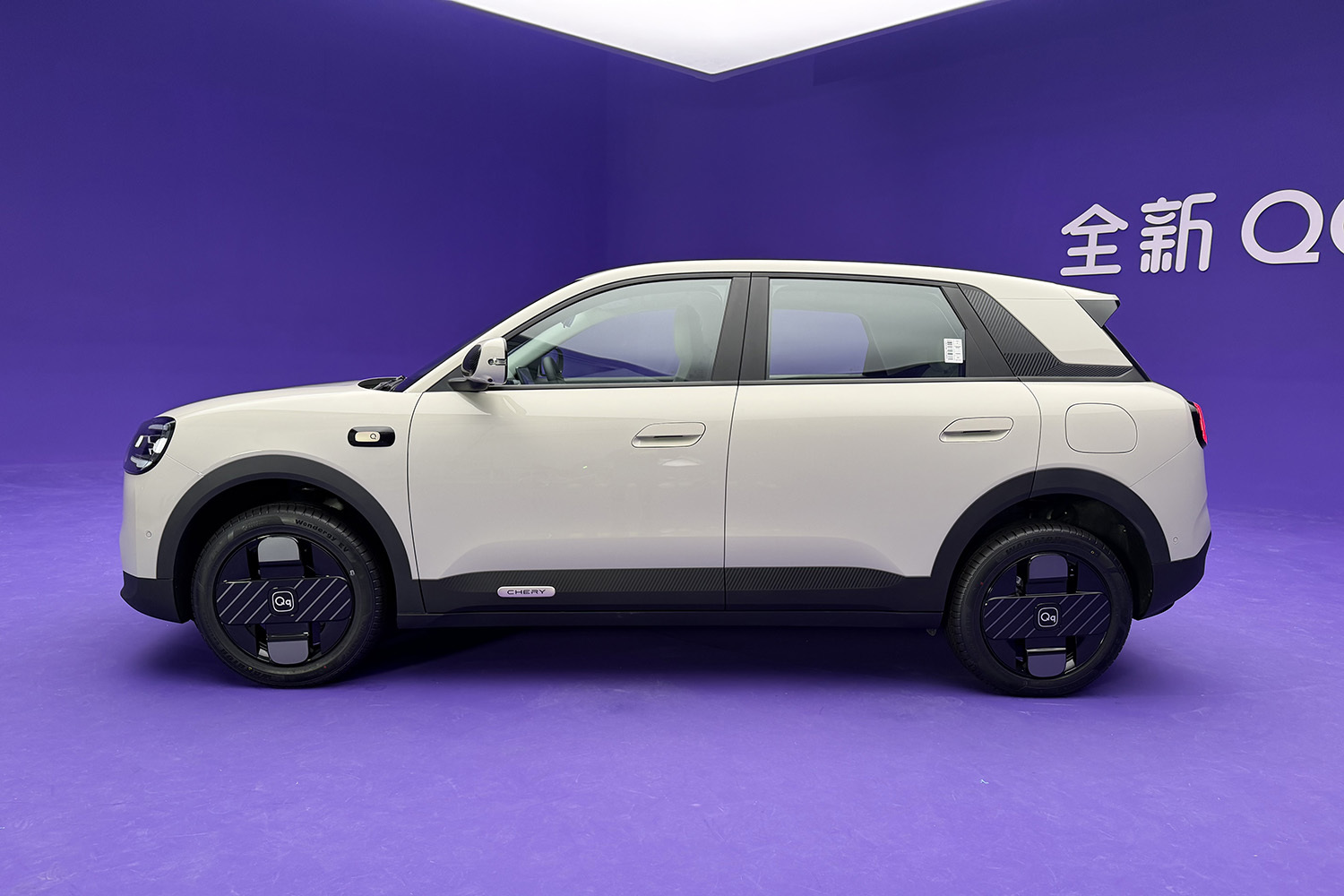 车身侧面延续圆润流畅的线条,悬浮式车顶搭配半隐藏式门把手,既降低了风阻以提升续航,又增添了现代时尚气息,外后视镜和车门下方以及C柱都采用了类似碳纤维的纹理。前翼子板上的“Q”字标识,让车型身份一目了然。