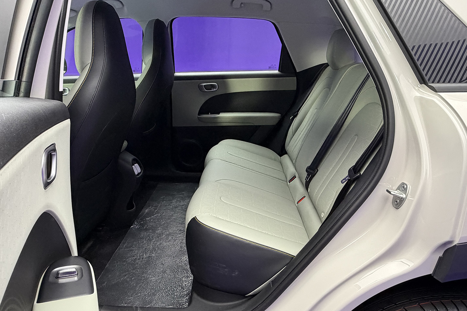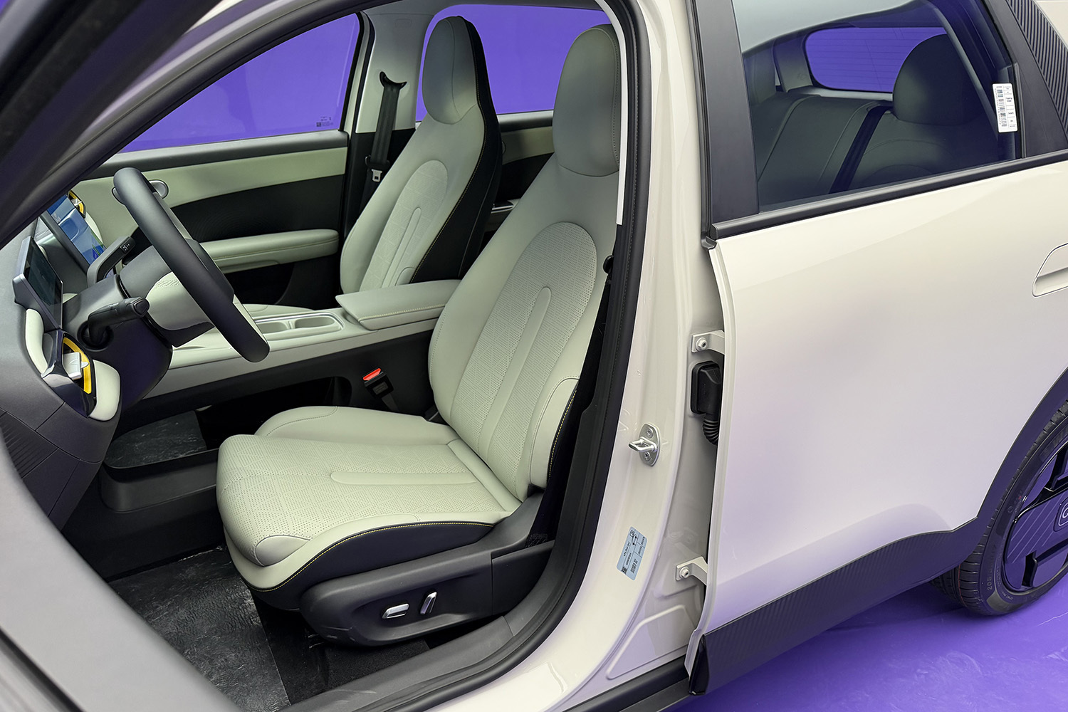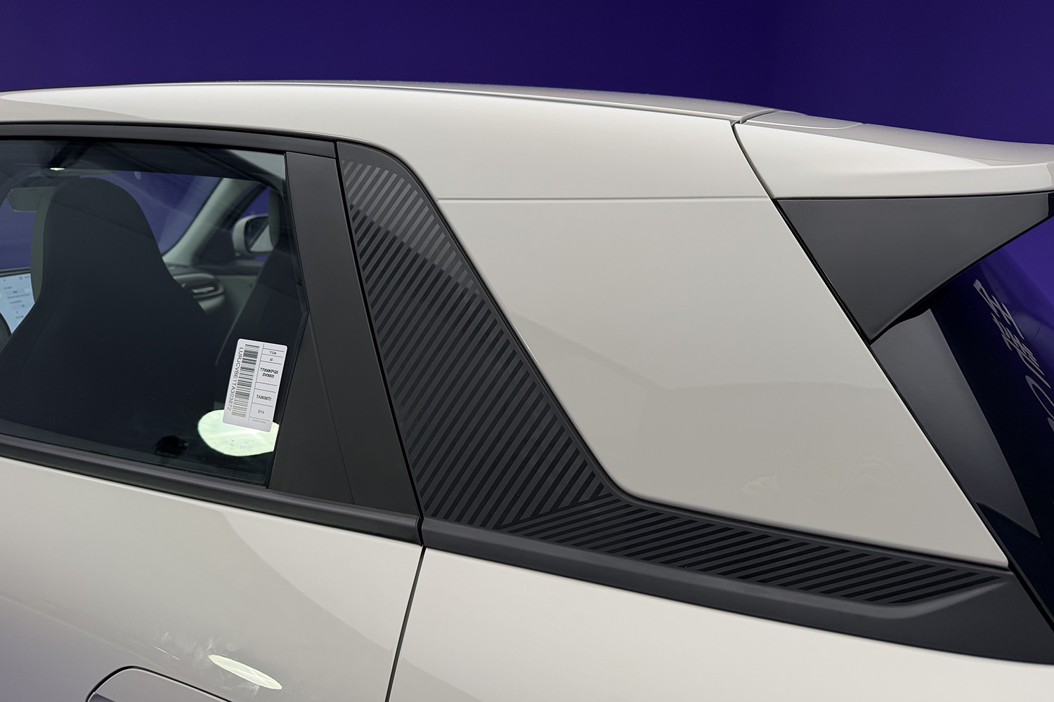 车身侧面延续圆润流畅的线条,悬浮式车顶搭配半隐藏式门把手,既降低了风阻以提升续航,又增添了现代时尚气息,外后视镜和车门下方以及C柱都采用了类似碳纤维的纹理。前翼子板上的“Q”字标识,让车型身份一目了然。