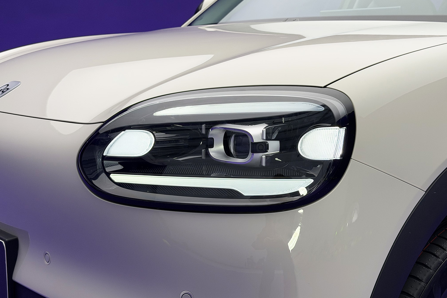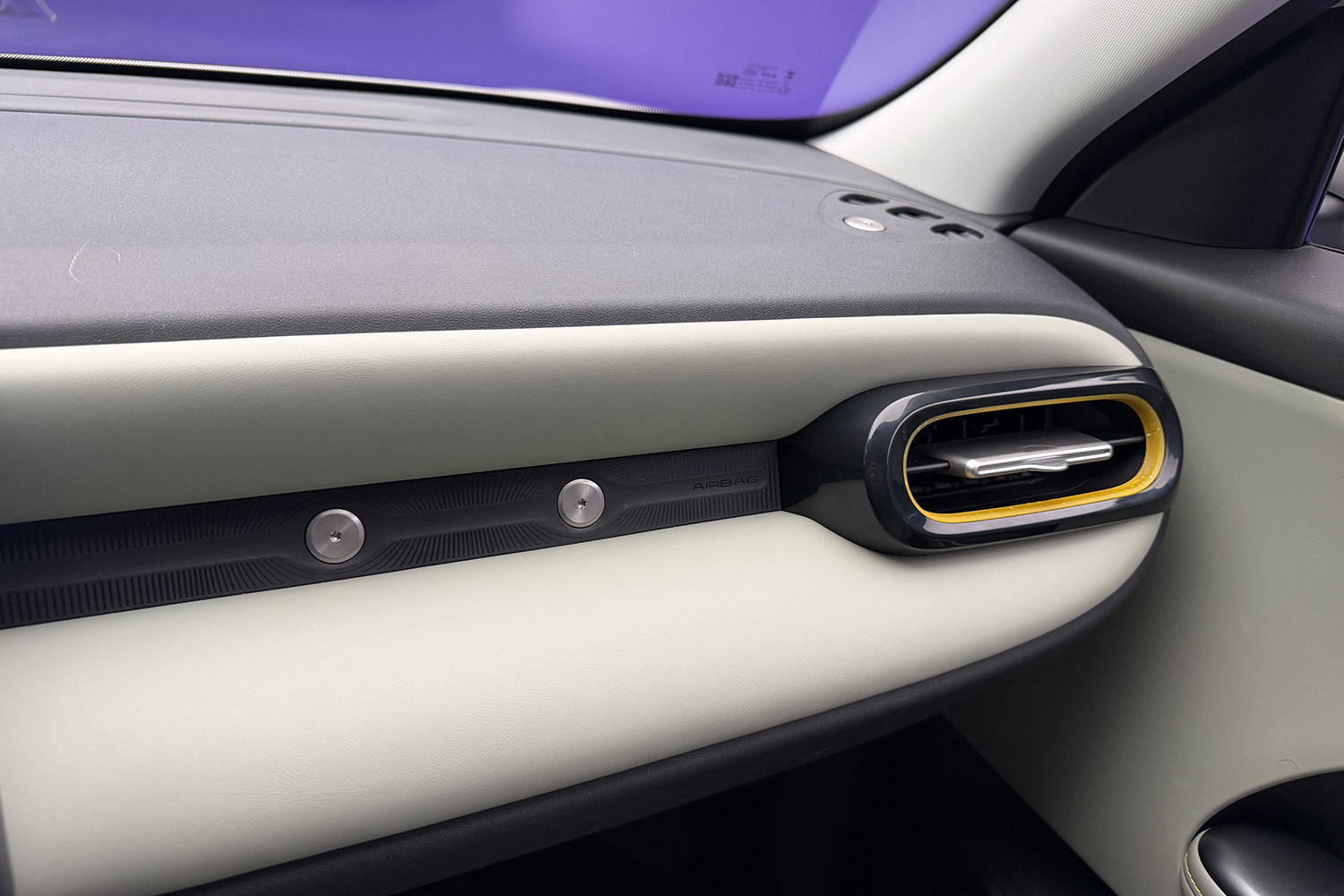 两侧Q型前大灯是设计亮点,内部藏有双条灵动光带,精致有余且萌感十足。前包围整体也采用了弧形的线条进行勾勒,同时两侧采用了斜纹的设计,让前脸看上去并不单调。