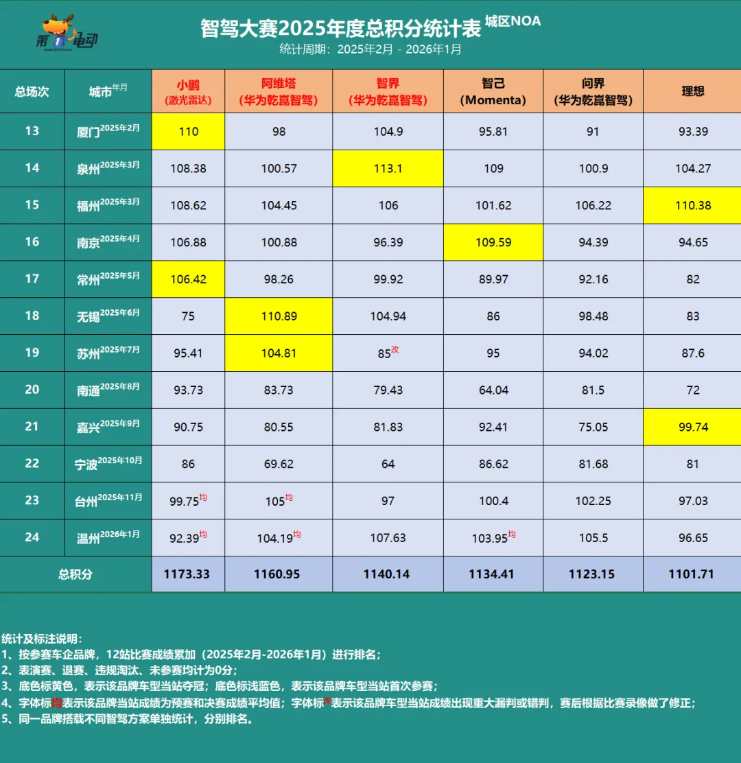 一、智驾大赛的年度积分榜,取值范围自2025年2月厦门站至2026年1月温州站,全年12站比赛期间,所有参赛的车企品牌的成绩;
