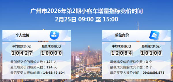 今日,广深两地2026年第2拍牌结果正式出炉,相比上期均微微上涨。先看看深圳拍牌情况【深圳拍牌官网截图】深圳2月拍牌最低价和上期持平,依旧为16100元,平均成交价则为17022元,涨幅不大。再来看看广州拍牌【广州拍牌官网截图】广州拍牌情况同样大差不差,继续保持1000..