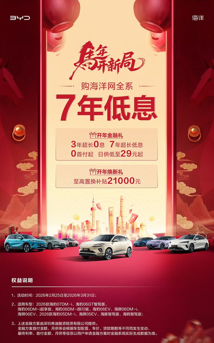 2月24日,比亚迪旗下方程豹汽车发布了 7 年超长贷的政策,适用豹5长续航版、钛7全系车型,首付3.2万元起,7 年费率低至1.5%,活动将于3月31日截止。2月25日,比亚迪海洋网发布“7年低息”政策,日供最低仅需29元,覆盖海洋网旗下的海豹、海狮、海豚、海鸥等多个系列,活动同样是3月31日截止。值得一提的是,2月28日比亚迪王朝网也官宣,所有车型推出7年低息及3年0息购车政策。