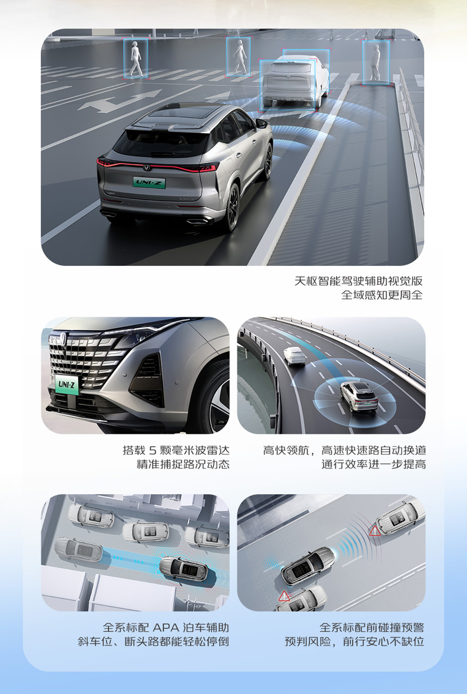 2026款UNI-Z PHEV还搭载天枢驾驶辅助视觉版,配备5颗毫米波雷达,支持AEB自动紧急自动、FCTA前方横向预警等18项主动安全功能以及高快路领航、城区拥堵环境的辅助自动跟车启停、ISL限速辅助智能调节车速以及至此多种停车位模式的APA泊车辅助功能和50米循迹倒车功能。