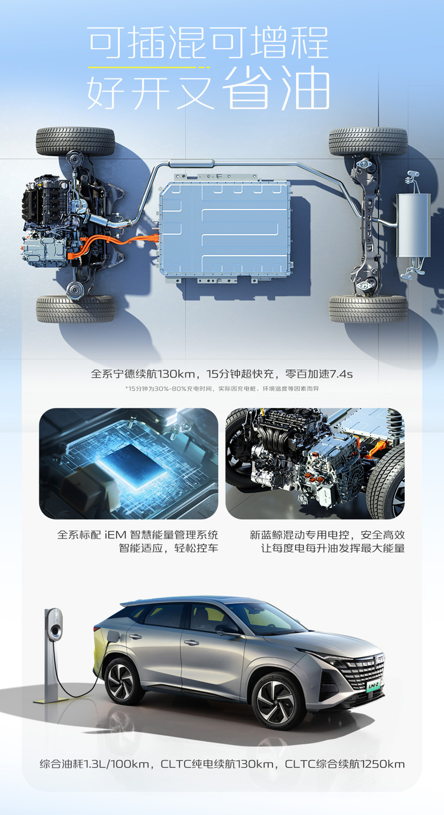 动力方面,2026款UNI-Z PHEV搭载新蓝鲸混动技术,搭载热效率43.31%的新蓝鲸混动专用1.5L发动机,搭配效率98.1%的新蓝鲸混动专用双电机,0-100km/h加速仅需7.4秒,综合油耗仅为1.3L/100km、WLTC工况的馈电油耗也低至5.09L/100km。得益于新蓝鲸混动专用电控盒A-ECMS控制算法协同,新车可一键切换增程和插混模式,日常城区通勤用增程模式纯电行驶零油耗,高速长途切换插混模式高效节能且动力不衰减。