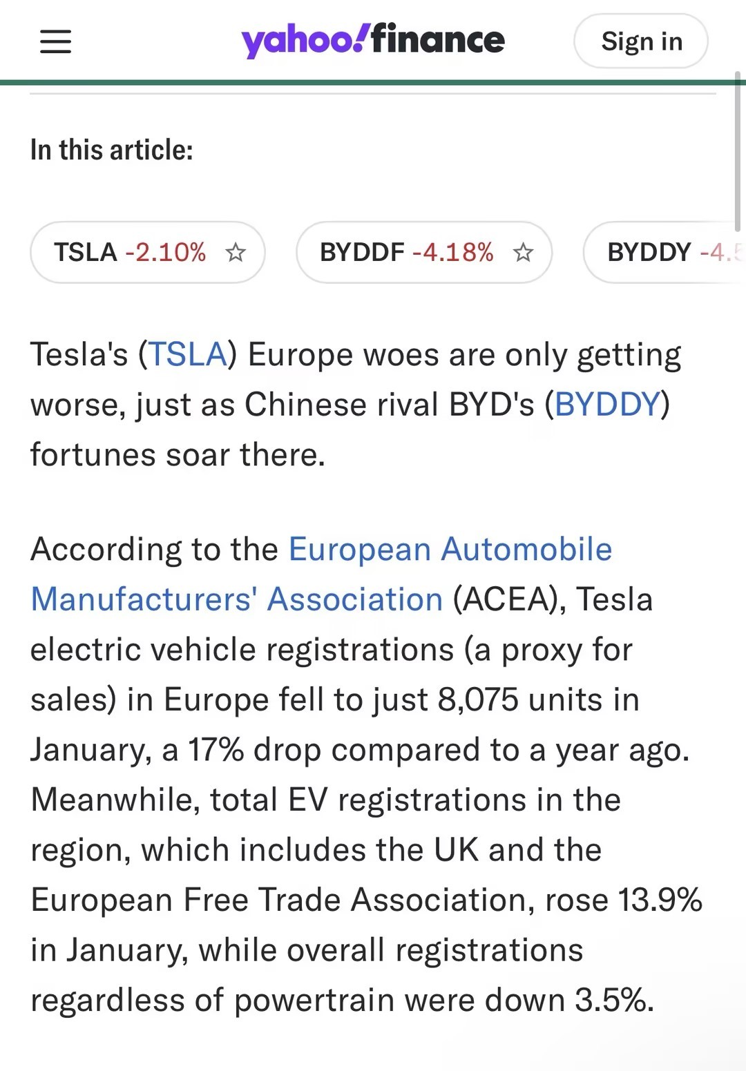 报道指出,根据欧洲汽车工业协会(ACEA)的数据,1月份特斯拉电动汽车在欧洲的注册量(可作为销量的参考指标)降至仅8075辆,同比下降17%。与此同时,包括英国和欧盟在内的欧洲地区,1月份电动汽车总注册量增长了13.9%,而所有动力系统的汽车总注册量则下降了3.5%。