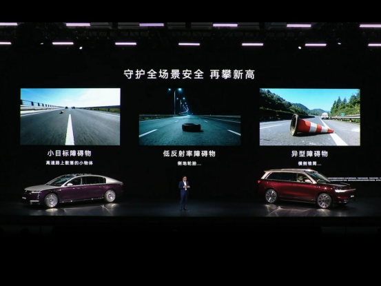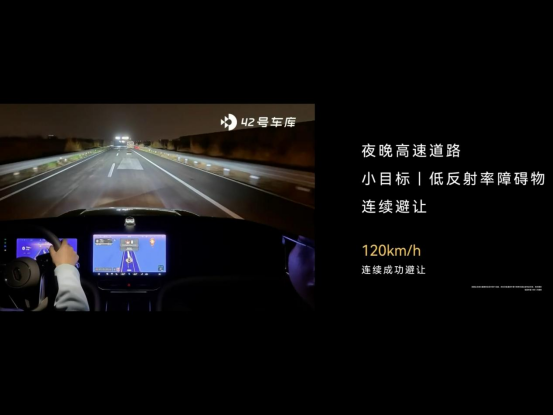 那么在实际表现上这颗896线激光雷达如何呢?它相较于之前192线激光雷达不仅可感知范围更广,还能覆盖更多高难场景。能够识别更小目标的障碍物,120米的距离就能识别14cm的小障碍物,辅助驾驶最高车速能达到120km/h。并且面对横倒轮胎这样的低反射率障碍物,以及横倒锥桶这样的异形障碍物它都能出色应对,搭载此硬件的问界M9可做到120km/h时速连续成功避让。