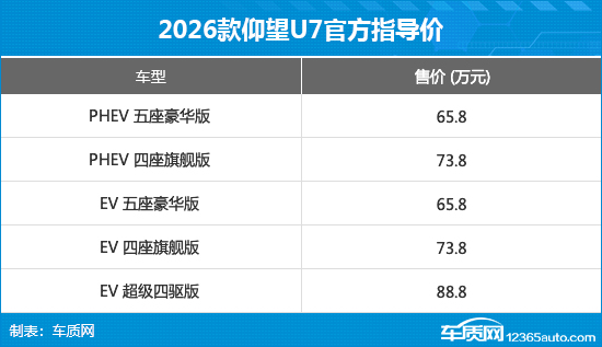 3月5日,2026款仰望U7正式上市,新车共推出5款车型,官方售价区间为65.8-88.8万元。同时,官方还推出金融优选方案、增换购礼遇、限时定金礼献等上市权益。