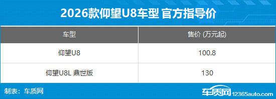 3月6日,2026款仰望U8/U8L正式上市。其中,2026款仰望U8售价100.8万起,重点针对易四方性能进行升级,2026款仰望U8L鼎世版售价130万起。两款车型的CLTC纯电续航里程均为230km,CLTC综合续航里程1205km。2026款仰望U8基本延续现款车型设计,标志性的“时空之门”前脸造型..
