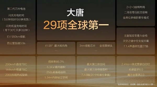 动力方面,新车DM-i版搭载的电机最大功率300kW,EV版纯电续航可达950km,并提供兆瓦闪充。