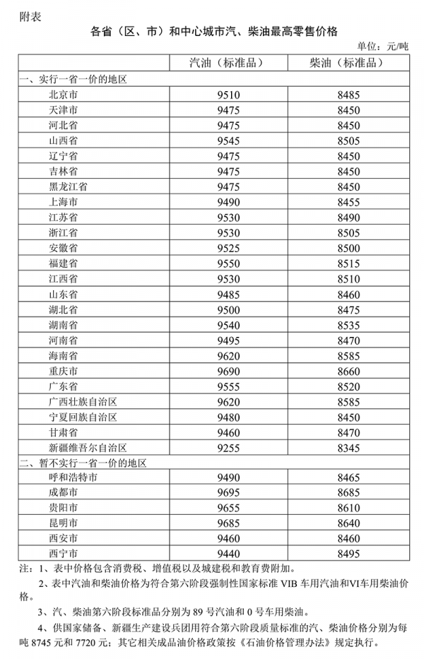 附:各省区市和中心城市汽、柴油最高零售价格表
