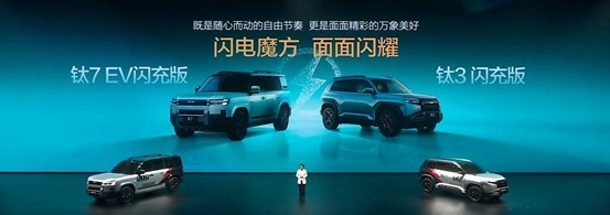 钛3闪充版搭载更大的电池和闪充技术,满电续航直接增加至620公里,能够实现10%到97%充电仅需约9分钟,续航里程迅速充至602公里,让潮流生活自由自在,成为年轻人玩乐出行的最强伙伴。而“全球首款闪充纯电大方盒”钛7EV闪充版,两驱版本的纯电续航更加达到了755 公里,10%到97%的充电时间仅需约9分钟,续航可直接迅速充至735公里。