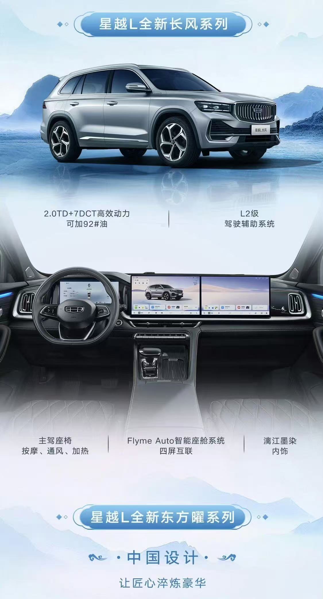 吉利中国星连续9年斩获燃油车销量冠军,此次承袭冠军势能,星越L推出全新长风系列,与全新东方曜系列形成双车系矩阵。其中,全新东方曜系列定位舒享豪华,全新长风系列延续经典豪华定位,以 “中国设计、智能科技、极致驾控、越享舒适、中国式安全” 五大豪华基因,重新定义中国燃油车的价值标准,为中国品牌燃油车市场注入强劲发展动力。