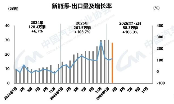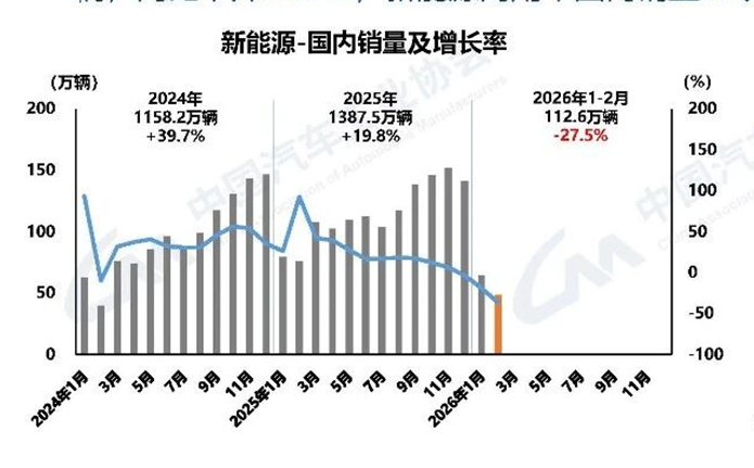 2月,新能源汽车产销分别完成69.4万辆和76.5万辆,同比分别下降21.8%和14.2%,新能源汽车新车销量达到汽车新车总销量的42.4%。