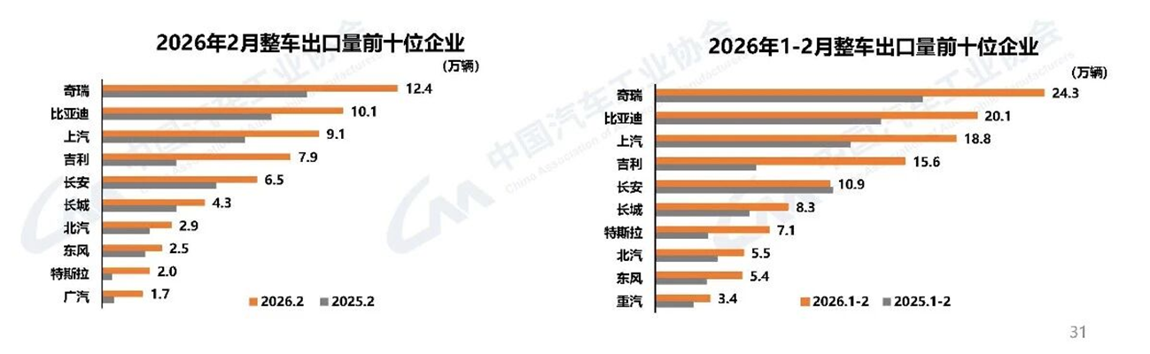 具体来看,2月,整车出口前十企业中,奇瑞出口量达12.4万辆,同比增长44.1%,占出口总量的18.5%。与去年同期相比,特斯拉出口增速最为显著,出口达2万辆,同比增长4.2倍。