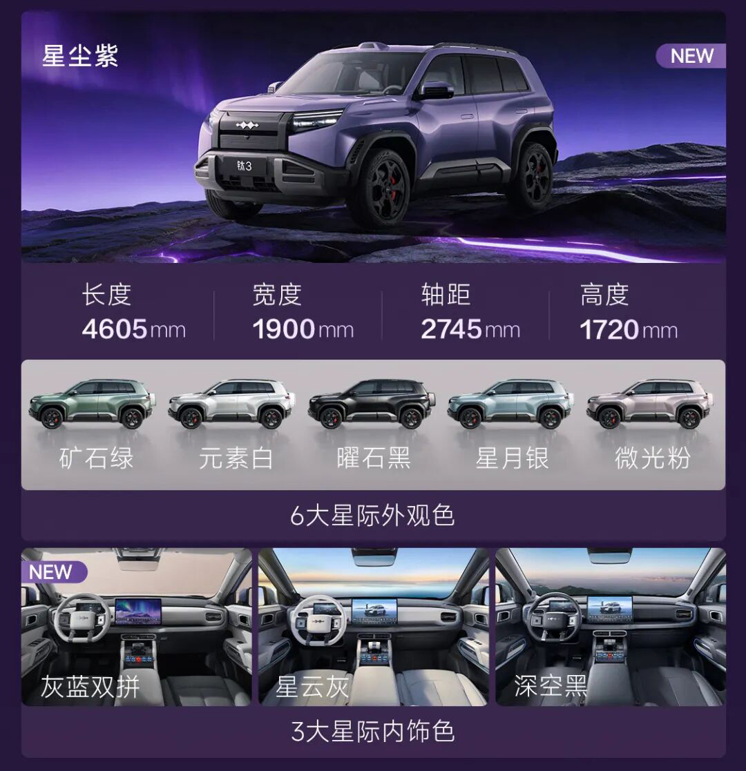钛3闪充版正式发布全新车身色星辰紫和灰蓝双拼的内饰色,其中星辰紫的车身油漆融入镍金属与镜面铝粉,漆面反射率提升30%,带来细腻且鲜活的色彩呈现。新车总共提供6款车身色和3款内饰色可选。