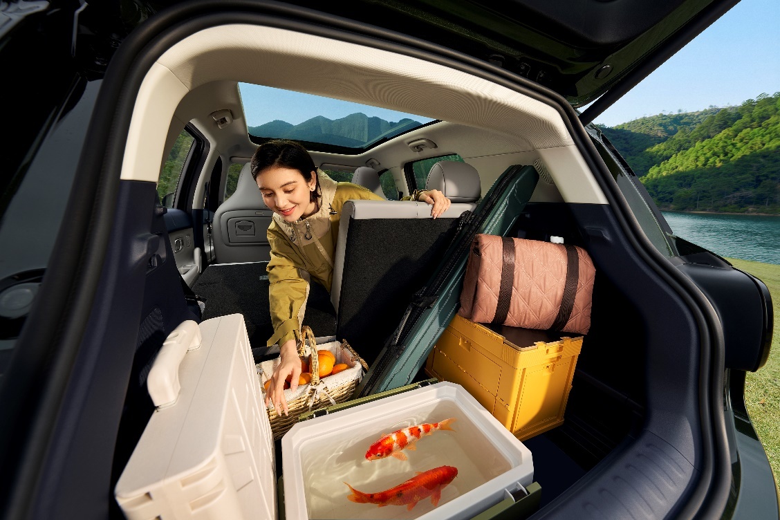 此外,零跑A10全车规划了34处储物空间,后备厢容积为602L,放倒后排座椅可拓展到1549L,此外后备厢地板下层还有106L下沉空间,并且有排水孔设计,可用高压水枪直接冲洗,适合放置有异味或脏污物品如钓具、雨鞋、露营装备、烧烤架等,并方便用户清理。