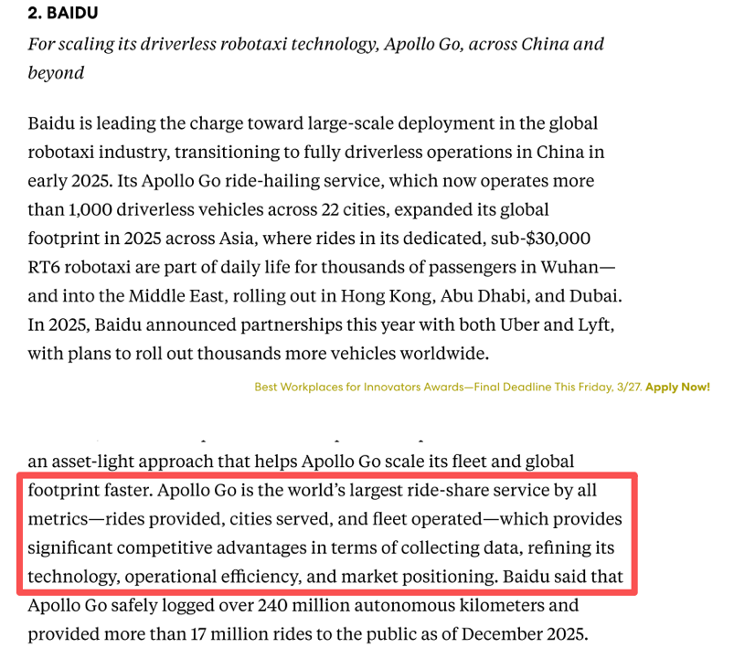 3月24日,全球权威商业媒体《Fast Company》发布2026年“最具创新力企业”榜单。百度凭借萝卜快跑(Apollo Go)入选Automotive类别全球第二,成为唯一进入该榜单前三的中国企业,凸显中国在无人驾驶领域的全球竞争力。