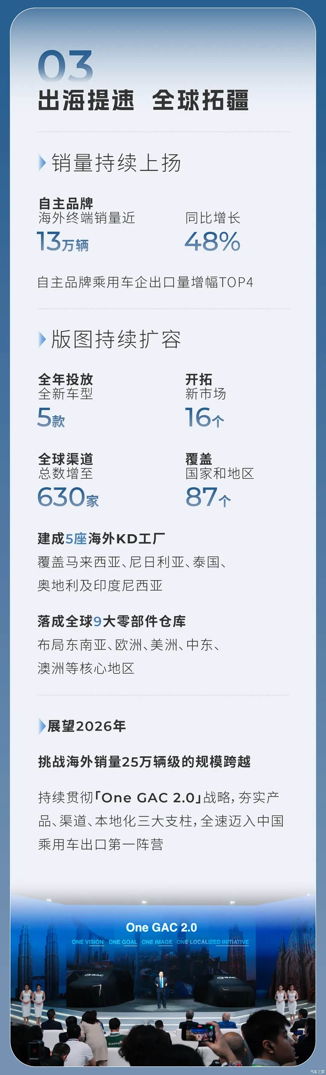 2025年广汽集团国际化布局全面提速,自主品牌海外终端销量近13万辆,同比增长48%。全年新开拓16个海外市场,投放5款全新车型,全球渠道总数增至630家,业务覆盖87个国家和地区;本地化制造与供应链布局持续完善,建成马来西亚、尼日利亚、泰国、奥地利及印度尼西亚5座海外KD工厂,落成覆盖东南亚、欧洲、美洲、中东、澳洲等核心地区的9大零部件仓库,实现从产品输出到体系出海的跨越。2026年广汽集团将挑战海外销量25万辆级的规模。