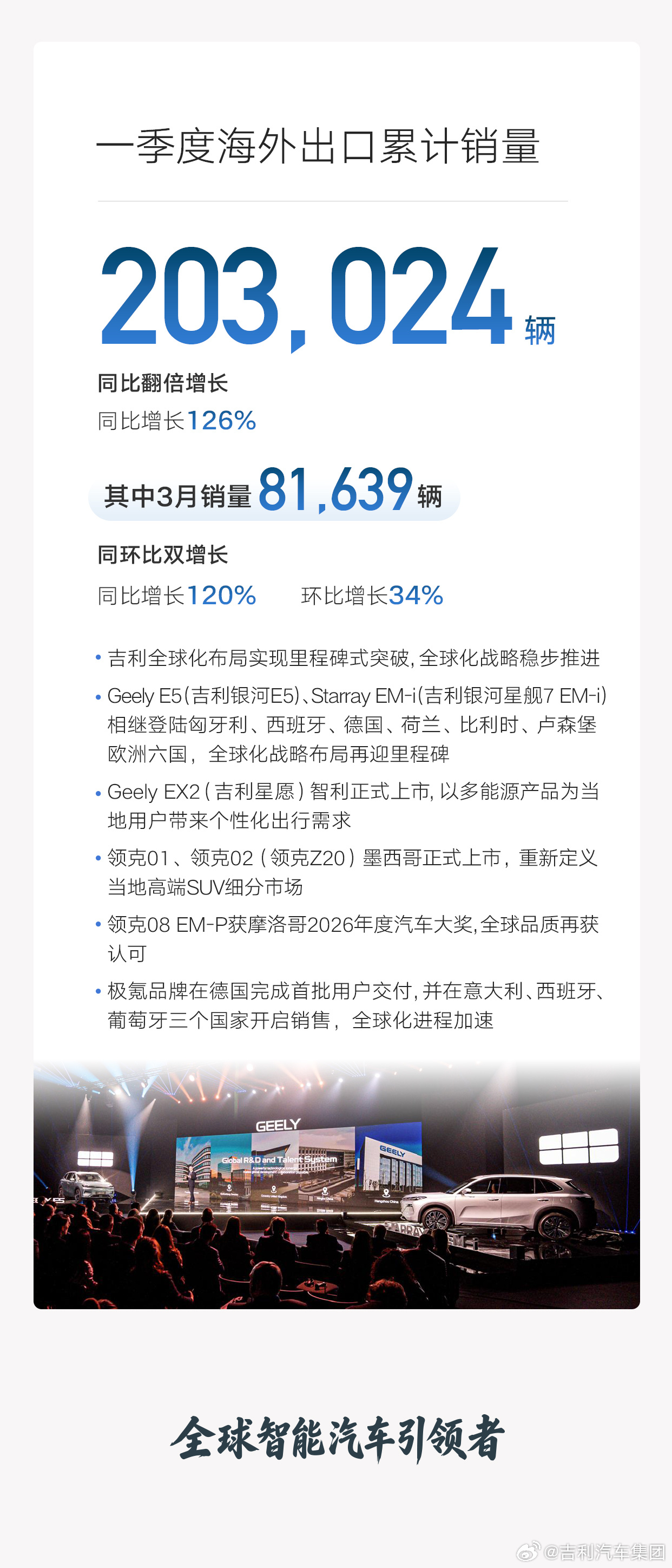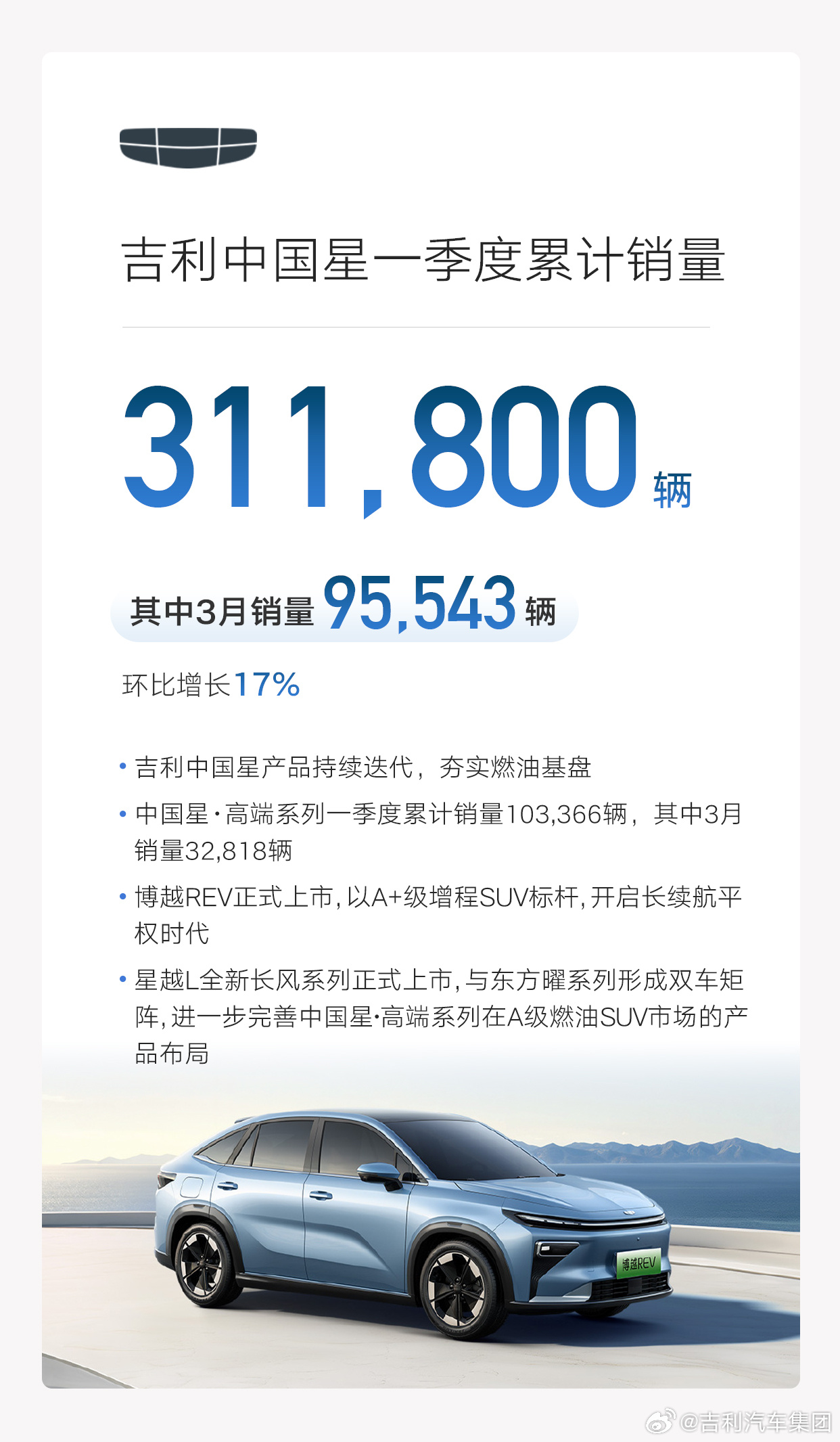 1、吉利品牌累计销量550659辆(3月销量95543辆);